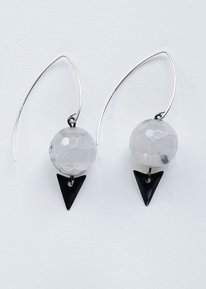 Boucles d'oreilles Argent 925, perles Agathes blanches "Matrix" facettées, breloques flèche noires effet émaillé. Pièce Unique.