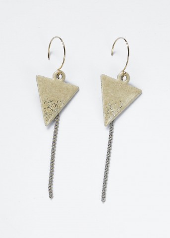 Boucles d'oreilles gold filled, triangles à effet emaillé gris et paillettes dorées, chaine bicolore grise et dorée.