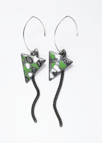 Boucles d'oreilles Argent 925, triangles effet émaillé gris et paillettes argentées réalisé à la main, chaine grise métal.
